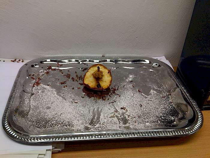 Dieser angefressene Pfirsich machte dem Bewohner einer vernachlässigten Wohnung wohl endgültig klar, dass er ein Problem hat. Er rief Schädlingsbekämpfer Daniel Krämer an und fragte, welches Tier hier wohl gefressen haben könnte. Ratten waren hier am Werk, wie sich das schnell herausstellte.