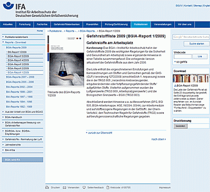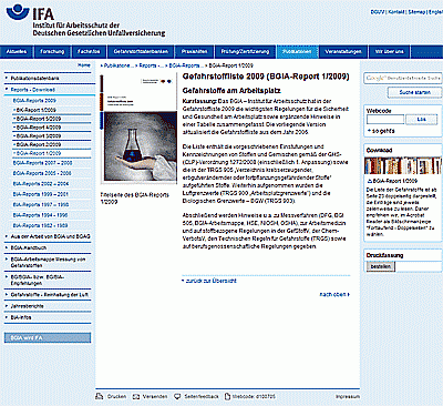 Die Gefahrstoffliste wurde im Dezember 2009 erstellt und erscheint deshalb noch unter der alten Bezeichnung BGIA-Report. Sie enthält aber die maßgeblichen Vorgaben für das Jahr 2010. Die Gefahrstoffliste kann unter www.dguv.de/ifa/gefahrstoffliste heruntergeladen oder als Druckfassung über ifa-info@dguv.de kostenlos bestellt werden. Weitere Informationen: www.dguv.de/ifa/gefahrstoffliste - zum Download der IFA-Gefahrstoffliste