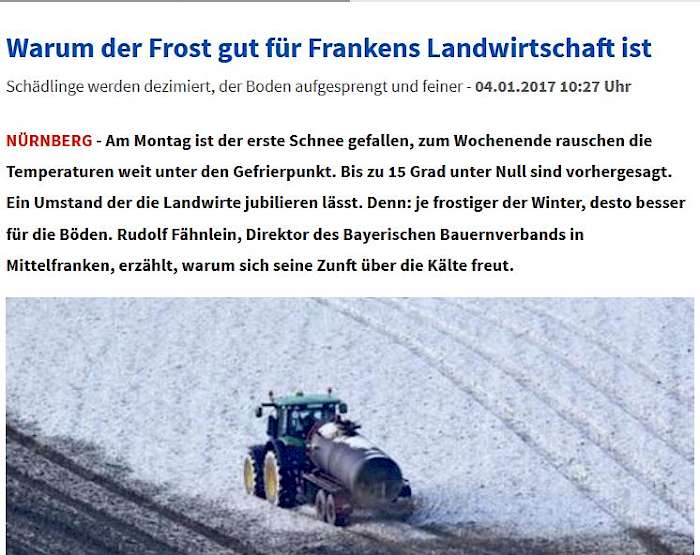 Frost ist gut für die Böden - dieser wird gelockert, außerdem fungiert eine zusätzliche Schneeschicht als Schutz für die Wintersaaten. Schädlinge werden ebenfalls durch die Kälte dezimiert, besondert, wenn es mehrere Tage kälter als minus 10 Grad ist. Die Redaktion Nordbayern sprach mit Rudolf Fähnlein, Direktor des Bayerischen Bauernverbands in Mittelfranken: http://www.nordbayern.de/region/warum-der-frost-gut-fur-frankens-landwirtschaft-ist-1.5725095