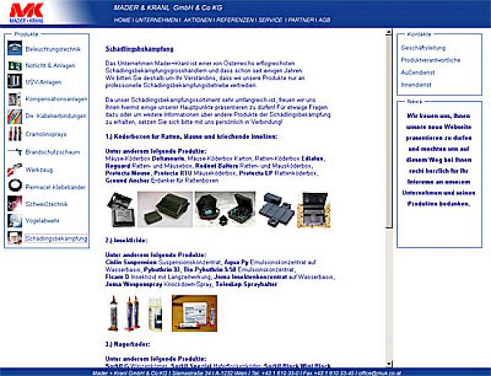 Damit zieht sich einer der bisher bedeutenden österreichischen Großhändler (Mader & Kranl-Formulierung: "... einer von Österreichs erflogreichsten Schädlingsbekämpfungsgrosshändlern und dass schon seit einigen Jahren") komplett aus dem Schädlingsbekämpfungs-Geschäft zurück. Mit anderen Geschäftszweigen wie Beleuchtungstechnik, Notlicht, USW-Anlagen, Kompensationsanlagen, Brandschutzschaum, Schweißtechnik und anderen Produkten wird die Firma aber weiter im Markt bleiben.