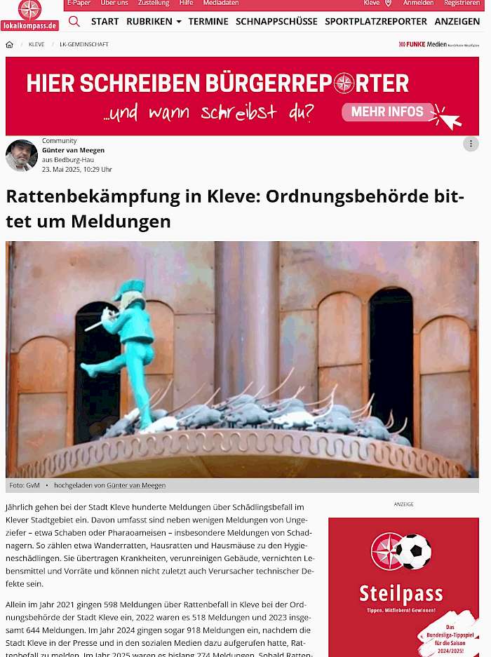 In Kleve bittet die Ordnungsbehörde die Anwohner um Meldungen von Ratten - auch, wenn nach einer Bekämpfungsmaßnahme wieder Ratten auftauchen. 2024 gingen 918 Meldungen über Ratten im Rathaus ein, bis Mai 2025 waren es über 270.