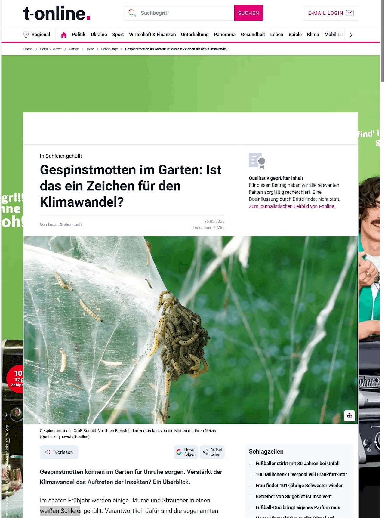 t-online.de erklärt, dass von einem weißen Schleier umhüllte Bäume und Sträucher im Frühjahr von Gespinstmotten betroffen sind, die dann beginnen, die betroffenen Gewächse "aufzufressen". Laut NABU verstärkt der Klimawandel die Intensität des Befalls. Bekämpfungstipps gibt es auch.